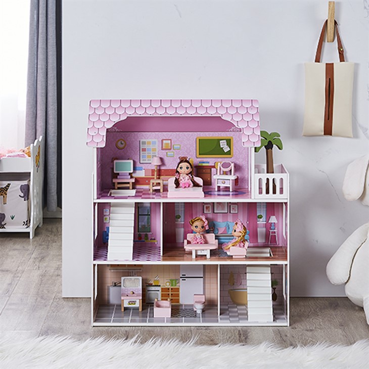 Цей дерев’яний рожевий ляльковий будиночок зазвичай складається з кількох кімнат, включаючи спальні, вітальні, кухні, ванні кімнати тощо.